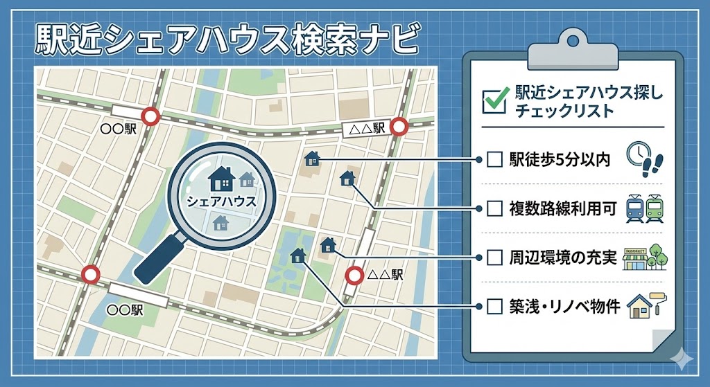 駅近シェアハウスを効率よく探すためのポイントを解説します。