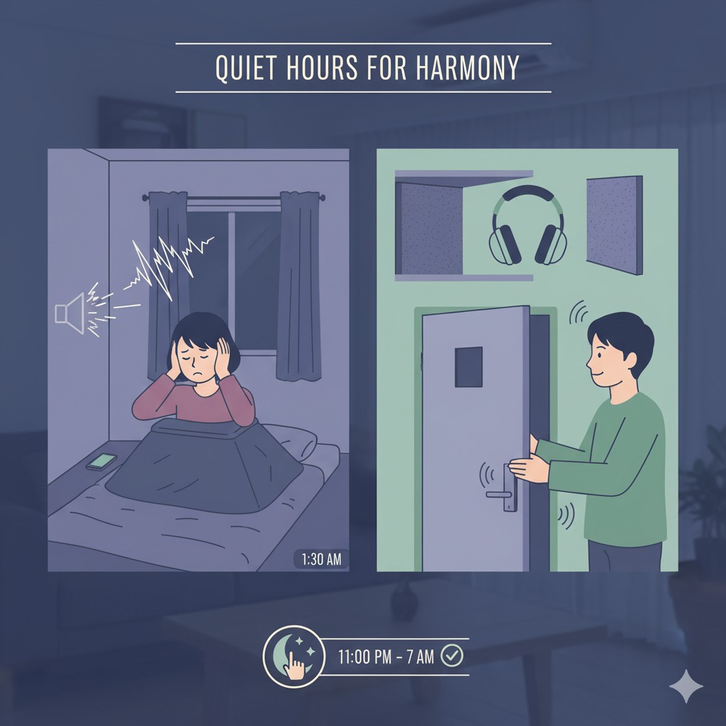 シェアハウスのルールで決められた時間(例:夜10時以降)は静かにすることを心がける。 - 音を出す前に声をかける
