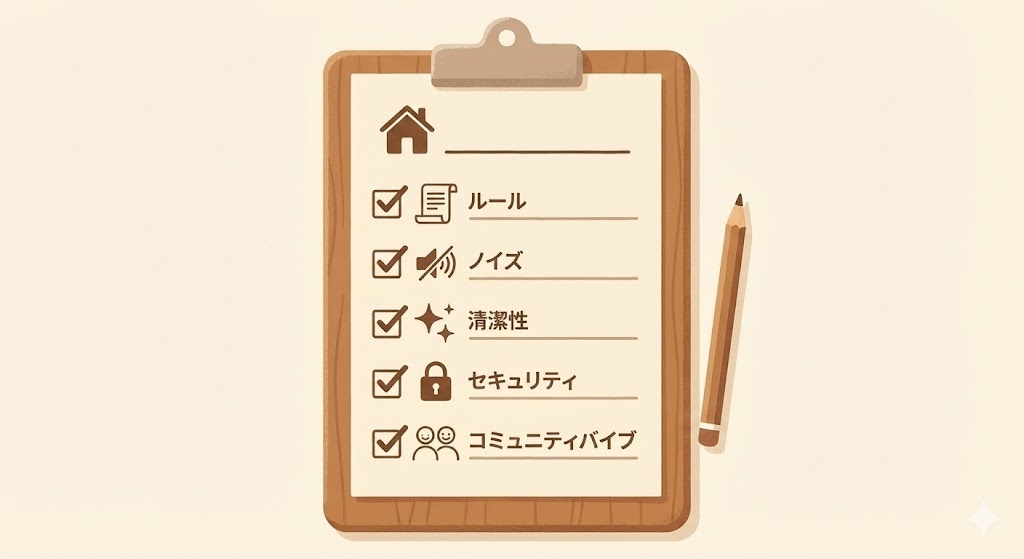 - 共用部のルール:掃除当番、ゴミ出し、来客ルール、深夜の過ごし方