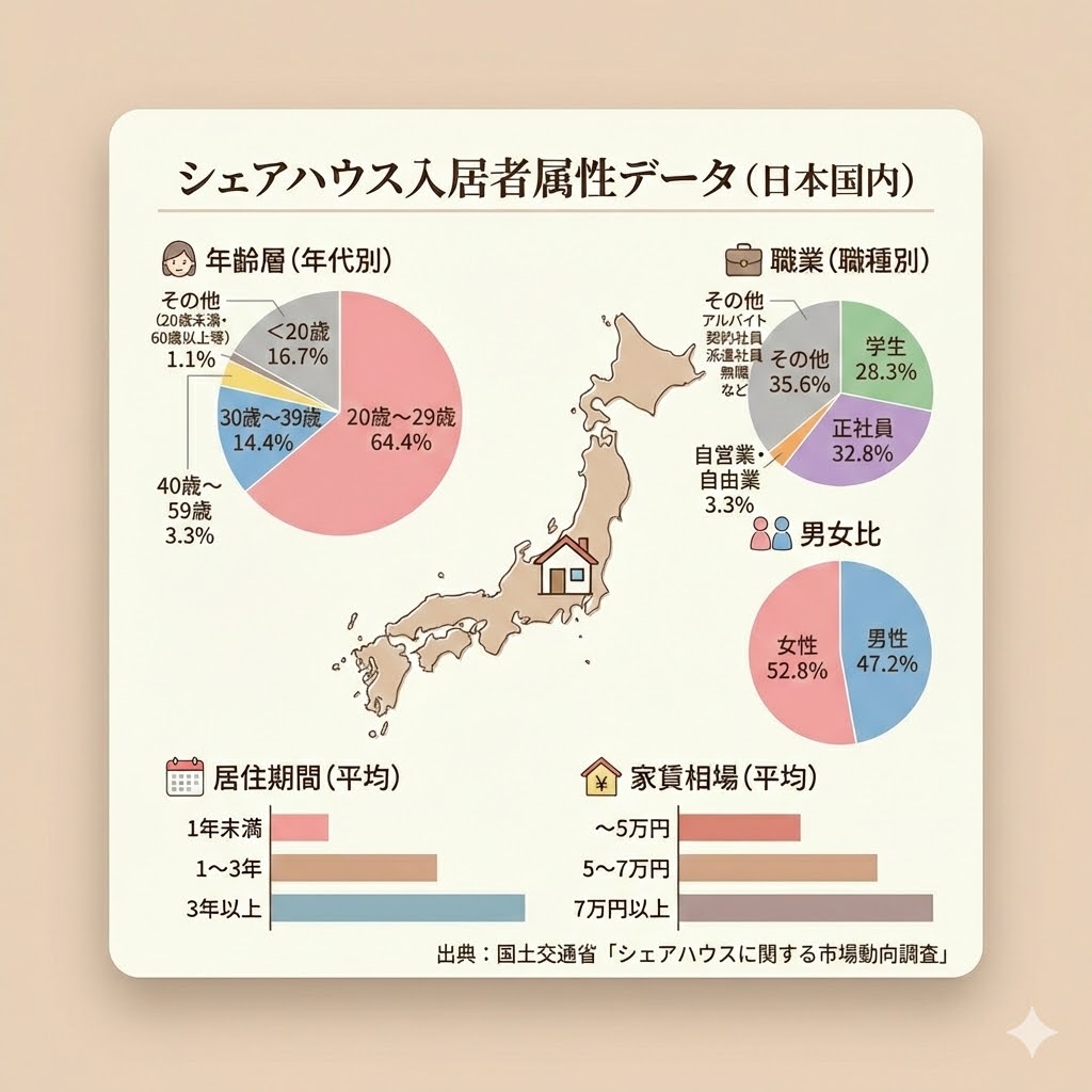 この記事では、国土交通省の調査データや実際の入居者情報をもとに、シェアハウスに住む人の年齢層、職業、ライフスタイルを徹底解説。