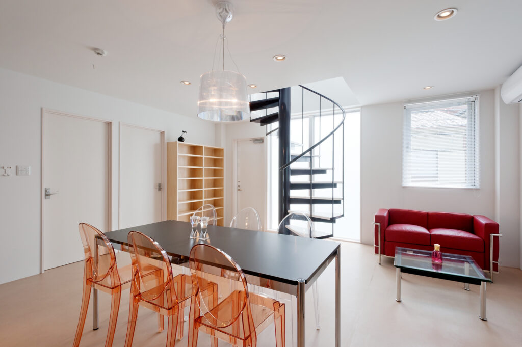 螺旋階段が印象的な19畳の共有リビング。共有部の家具はイタリアの高級家具メーカー・kartellを中心にコーディネートされた空間は、大人の女性の洗練された暮らしを一層充実したものにするでしょう。